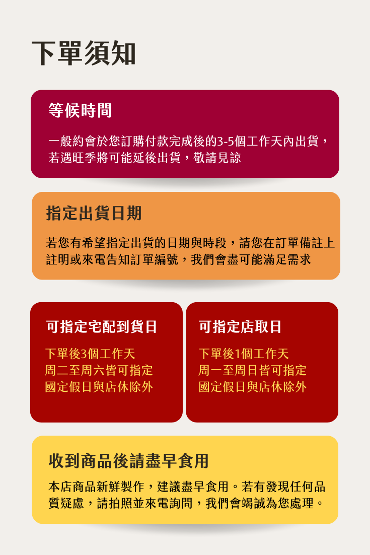 🔹黑貓宅急便1/30起因旺季關係不得指定到貨日期與時間,只能盡量幫您安排,若有商品品質保存建議選擇冷藏配送或自取