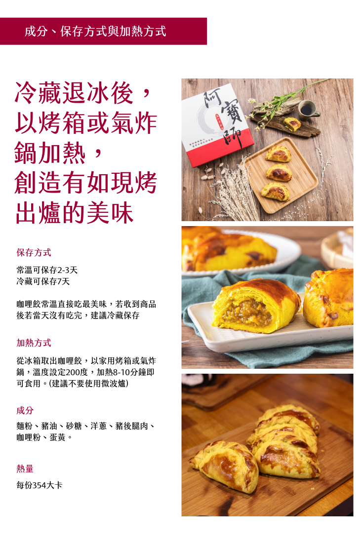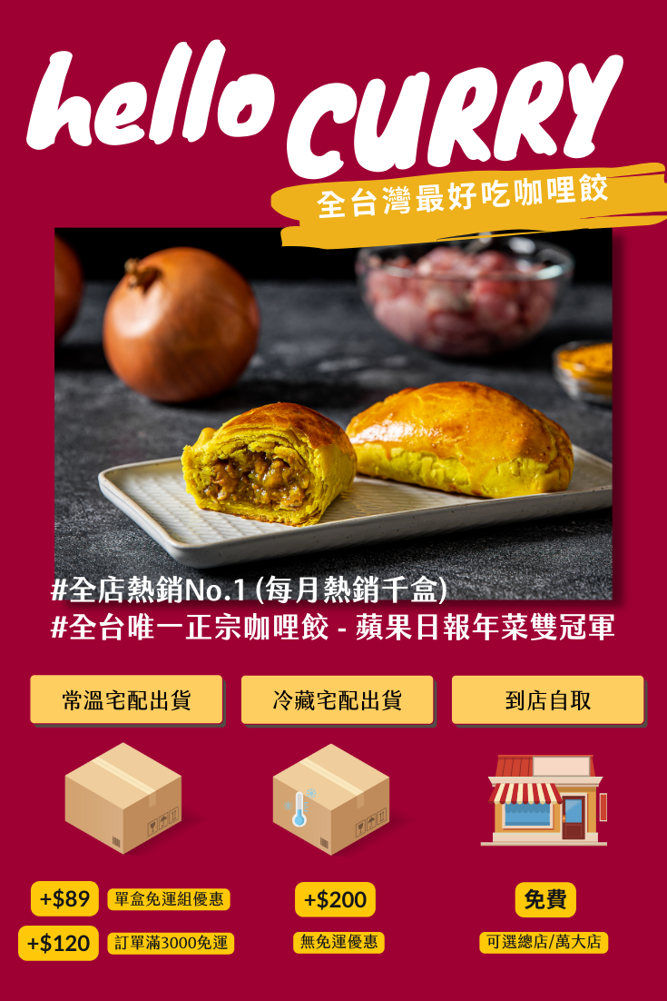 盒裝6/8/10入咖哩餃。室溫保存2~3天;冷藏保存7天(請放於陰涼處),運費另計。